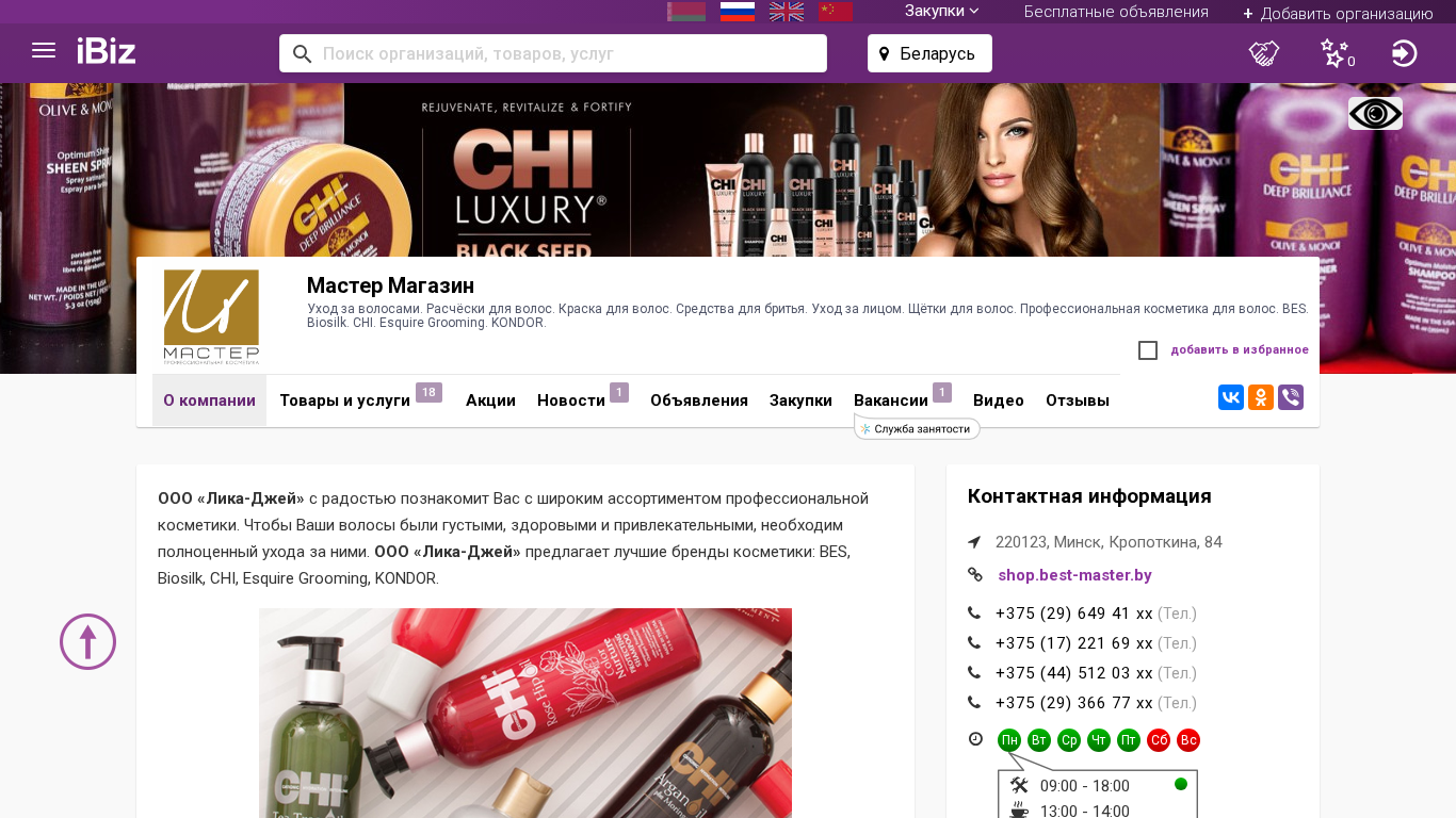 | Название / Заголовок | Мастер Магазин - Уход за волосами. Расчёски для волос. Краска для волос. Средства для бритья. Уход за лицом. Щётки для волос. Профессиональная косметика для волос. BES. Biosilk. CHI. Esquire Grooming. KONDOR.. 220123, Минск, , Кропоткина, 84 |