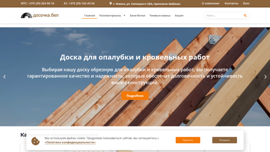 | AI-анализ | The web project "Dosochka.by" offers a wide range of pilomaterials and garden houses in Minsk at affordable prices. The company's contact information includes phone numbers +375 (29) 142-43-54 and +375 (29) 263-90-16. The physical location is given as g. Minsk, ul. Selitskogo 23A, promzona Shabany. The website contains sections for various types of pilomaterials such as anti-septic pilomaterials, e.g., antiseptic burs, pilomaterials of natural humidity, obrezny oblomki (obrezny means oblique or beveled) e.g., obrezny burs and obrezny deska (deska means board or plank |
