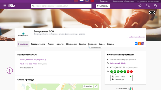 | AI-анализ | This website is a business based in Belarus, specifically located at 223053, , Боровая д. The company, named Belproveteh OOO, provides veterinary services, zootechnics, corn additives, and disinfecting agents. The website offers various information, including company details, products and services, contact information, and working hours. Users can also add the company to their favorites, view news and vacancies, and write reviews. The website is in the categories of 'Veterinary preparations - production, sales' and 'Veterinary preparations - production, sales in Minsk'. The contact details provided are a phone number, +375 (33) 303 70 xx, and an email address for a manager. The working hours are from Monday to Friday, 9:00 AM to 6: |