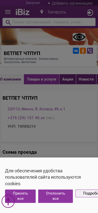 | Название / Заголовок | ВЕТПЕТ ЧТПУП - Ветеринарные клиники. Зоомагазины. Зоосалоны. Ветаптеки.. 220113, Минск, , Я. Коласа, 49, к.1 |