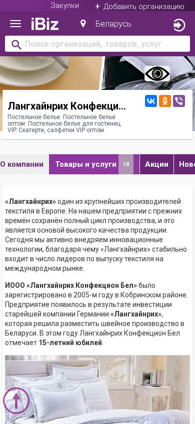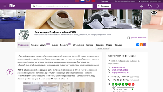 | AI-анализ | This website is a Belarusian company, Langheinrich Konfektsion Bel IOOO, specializing in the production and sale of bedding and table linen. The website offers bedding and table linen in bulk for wholesale and for VIP hotels. The company also provides schemes for arrival, contact numbers, and address information. Langheinrich Konfektsion Bel IOOO was registered in 2005 in the Kobrin district and is a subsidiary of the oldest German company, Langheinrich, which established the sewing production in Belarus. The company celebrates its 15th anniversary this year and has expanded its product line to include the production and sale of finished textile products for both Belarusian and international markets, as well as retail sales. Table linen from Langheinrich Konfektsion Bel IOOO is used by |
