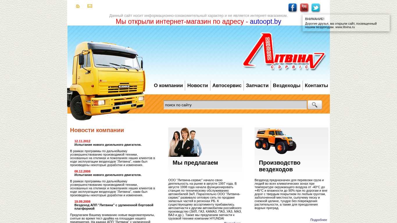 | AI-анализ | The web project "Litvina-service" is dedicated to providing parts and repair services for various vehicles, including ZIL, GAZ, UAZ, MAz, and KAMAZ, with a focus on all-terrain vehicles (APVs). The site offers information on the company, its history, and news, as well as a section for technical servicing and parts sales. The main keywords reflect the types of vehicles and services offered, such as "ZIL parts," "GAZ repair," "MAZ sales," and "KAMAZ services." The site does not operate as an online store but instead refers users to an independent e-commerce platform at autoopt.by for purchasing parts. The company's news section includes articles on product testing, vehicle modifications, and collaborations with other companies. The site was established in 1997 and began offering technical services for ZIL |