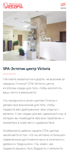 | AI-анализ | The website SPA-Эстетик центр Victoria is a spa and aesthetic center located in the heart of Minsk, Belarus, at the address Проспект Победителей, 59A. The website offers various services including a VIP-sauna, spa treatments, cosmetology procedures, and special promotions. The center features a beauty salon, manicure and pedicure cabins, cabins for apparatus cosmetology, and massage rooms. The team of professionals at the center prioritize individual approaches to cater to the preferences of their clients. The website also features an aquazone with facilities such as a Turkish bath (hammam), a 22-meter swimming pool, a Finnish sauna, two jacuzzis, a waterfall, and a fountain. The website provides contact information, operating hours from 8:0 |