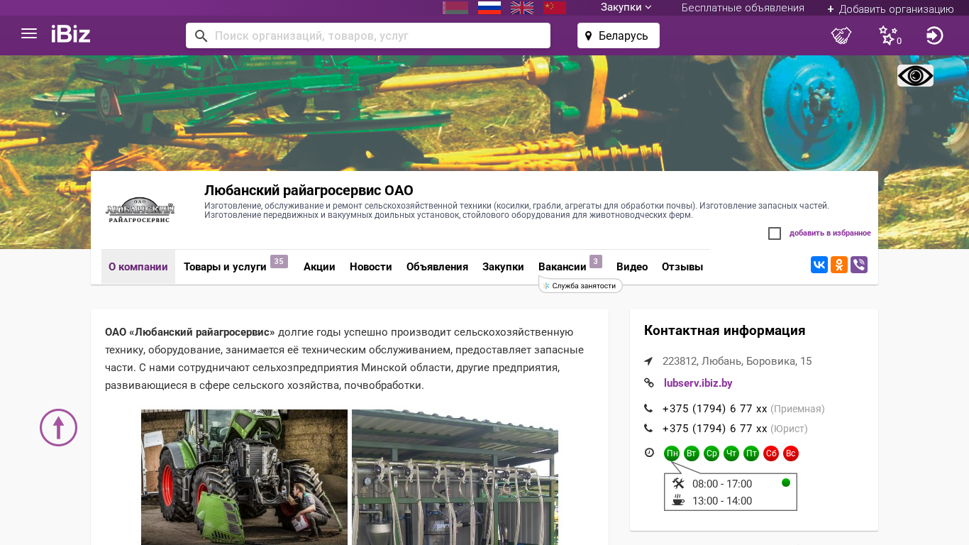 | Название / Заголовок | Любанский райагросервис ОАО - Изготовление, обслуживание и ремонт сельскохозяйственной техники (косилки, грабли, агрегаты для обработки почвы). Изготовление запасных частей. Изготовление передвижных и вакуумных доильных установок, стойлового оборудования для животноводческих ферм.. 223812, Любань, , Боровика, 15 |