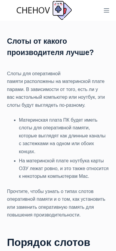 | AI-анализ | --- The website chehov.by provides information on slot types and their installation for computer memory (RAM) on various motherboards, with a focus on PC and notebook systems. The content covers topics such as the number of memory channels, slot arrangements, and color coding for identifying compatible RAM pairs. The website also emphasizes the importance of installing RAM in the correct order and ensuring compatibility with the motherboard's specifications to maintain optimal performance. |