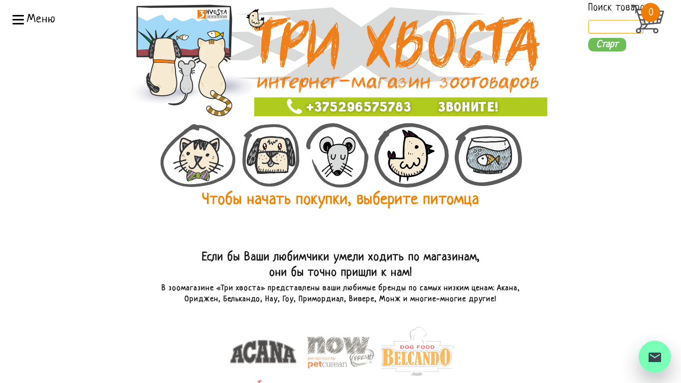 | SEO-описание | Интернет-магазин зоотоваров Три хвоста. Товары для собак и кошек, Сухие корма, консервы, переноски, игрушки, лотки и наполнитель. Аквариумы и террариумы, клетки и вольеры для птиц. Более 5000 наименований товаров для Ваших питомцев с бесплатной доставкой по Минску | 3hvosta.by |