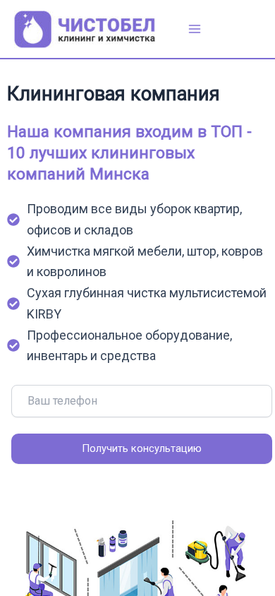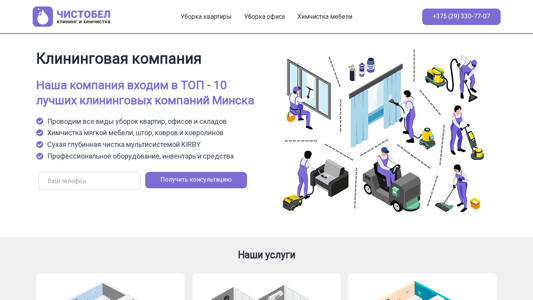 | AI-анализ | This website is for a cleaning and chimney sweeping company named Chistobel in Belarus, as indicated by its title "СHISTOBEL - ЧИСТОБЕЛ" and description "Клининговая компания Наша компания входим в ТОП - 10 лучших клининговых компаний Минска". The website offers cleaning services for both residential and commercial properties, including apartment and office uborka (cleaning), and hymchistka (chimney sweeping) for mebeli (furniture) and kovrov (carpets). The company uses professional equipment and techniques, and offers a range of services including general cleaning, cleaning after renovation, and window cleaning. The website also states that they have been in business for over 12 years and have many loyal customers, with a friendly and orderly |