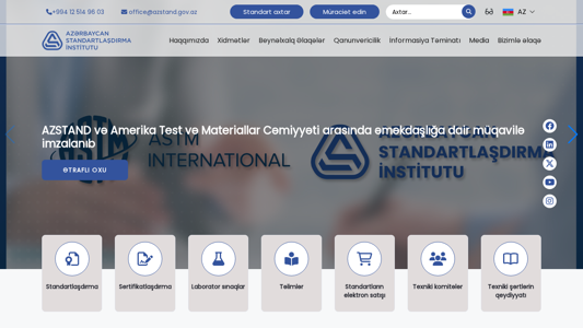 | AI-анализ | This website is the official website of the Azerbaijan Standardization Institute. It provides information about the institute's activities in the field of standardization, certification, and testing services. The website offers various standards for sale, including electronic ones, and has a section for laboratories and training. It also deals with "HALAL" certification and international collaborations with organizations such as ISO, CEN, IEC, and MGS. The website includes a contact section, a FAQ, and information about the institute's history, mission, and services. The website is available in Azerbaijani and English languages, and the font size and style are adjustable. |