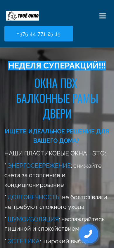 | AI-анализ | The web project "Tвое окно" specializes in the production and sale of PVC windows and doors in Slutsk and its surrounding area. Services include the manufacturing and retail of windows of various complexities. The company operates in the cities of Slutsk, Soligorsk, Nezvish, Klets, M. Gorca, Uzda, Dzerzhinsk, Lyuban, S. Dorogi, Storobin, Kryvyi Sloboda, Kopyl, Rudensk, Pukhovichi, Horodeya, and Stolbtsy. With thousands of satisfied clients and a decade of experience, the company offers energy savings, durability, sound insulation, and aesthetics for your home. Contact information includes a phone number for super deals and the option to request a consultation. The website features information on various types of PVC windows and |