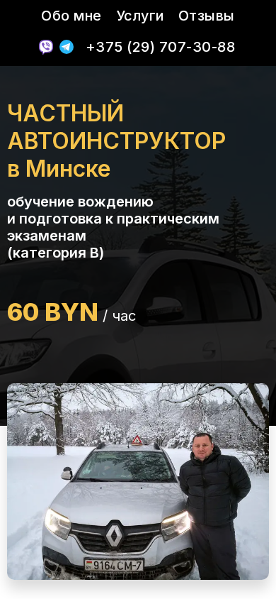 | AI-анализ | This website is for additional driving lessons with a personal driving instructor in Minsk, Belarus. The service offers driving education and preparation for practical exams at the State Automobile Inspection (GAI). The instructor, named Aleksey Klochko, emphasizes individual approaches for different students and uses a modern, serviced vehicle for teaching, which features a manual transmission and does not require shifting gears with both hands or leg pain from practice sessions on a trainer. The instructor has over 15 years of experience in teaching and over 25 years of driving experience, with a 90% exam pass rate and 7500 satisfied students. The website also mentions the availability of training on students' own vehicles if they have already passed their driving test but need to improve certain skills. The cost for each lesson is 60 BYN. The instructor works officially and does not smoke or run late. |