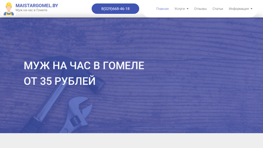 | AI-анализ | The portal Maistargomel.by offers hourly services for handymen in Gomel, Belarus. The website focuses on solutions for plumbing and electrical issues, as well as minor household repairs. The company guarantees its work and provides a check upon completion. To contact the service, call +375296684618. The main services listed include plumbing and electrical work, as well as furniture assembly, appliance installation, and blind installation. The website highlights the advantages of an experienced and polite master, who will come to your home at a convenient time to tackle specific issues. The payment options include cash and card payments. The FAQ section includes questions regarding the company's service areas, pricing, and the possibility of completing tasks more quickly than an hour. The website does not provide information on the cost of each specific service, as the pricing depends on the time and complexity of |