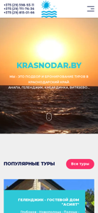 | AI-анализ | --- The portal krasnodar.by is a tour booking and arrangement service for travel destinations in the Krasnodar region. Popular tours include Anapa, Helendzhik, Kabardinka, Vityazevo, among others. Offered tours range from 265$ to 285$ with additional touruservice. Detailed information on specific tours and accommodations in Anapa, Gluobokoje, Novopolotsk, Polotsk, Vitsebsk, Orsha, and Mogilev are provided. Contact information includes addresses and phone numbers in Vitsebsk, Gluobokoje, and Novopolotsk. The legal entity is a CHTUP "Turagentstvo Mir VoKrug Nas" with UNP 391492843, and is a participant of FOT and RATA. Popular |
