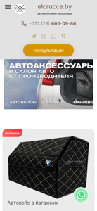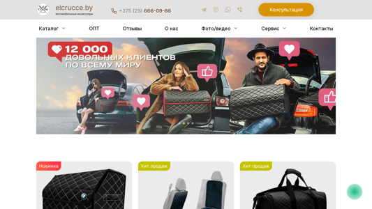 | AI-анализ | --- The web project elcrucce.by offers automobile organizers, auto trunks, bags, and accessories for purchase in Minsk. The project includes a catalog, consultations, and actions. Products include various types of auto trunks (Premium, Standard, Economy), road bags, shoppers, and various accessories such as a notebook bag, rucksacks, waist-worn bags, document folders, protective covers, car seats for dogs, and gift sets. The site also includes an FAQ section, return and payment policies, and delivery and contact information. Currently, there are promotions for a car trunk in the baggage compartment for 59 BYN, protective covers for 30-35 BYN, a road bag for 80-85 BYN, a document folder for 35-40 BYN, a waist-worn pad for |