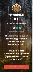 | AI-анализ | The portal is a building materials supplier based in Minsk, Belarus, offering delivery services. The title is "Пиломатериалы от производителя с доставкой по Минску" which translates to "Timber materials from the producer with delivery to Minsk". The description mentions "доставкой по Минску и обл." which means "delivery to Minsk and the region". The website accepts both cash and non-cash payments and has a contact email address and phone number. The company produces and sells a range of timber materials for roofing, stropil systems, carpentry, and other building projects. The available products include various types of boards, beams, and rods, with prices listed for each. The website facilitates the calculation of required materials and their delivery, and offers custom sizes upon request. The business hours are from |