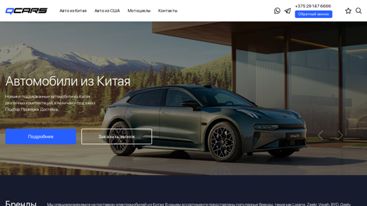 | AI-анализ | The website qcars.by offers vehicles from China for order with delivery to Belarus. The site features the selection of electric vehicle models, calculation of prices, and assistance with order placement. The inventory includes new and used vehicles of various configurations, available for purchase and order. Additionally, the site provides information on vehicles from the United States that meet the highest international standards. Brands specializing in the sale of electric vehicles from China are featured, such as Lixiang, Zeekr, Voyah, BYD, Geely, and others. Examples of vehicles in stock include the Geely Galaxy E5 for 57,722 BYN (approximately $19,000 USD), Geely Atlas (Boyue) Cool for 69,874 BYN (approximately $23,000 USD), and Geely Monjaro for |
