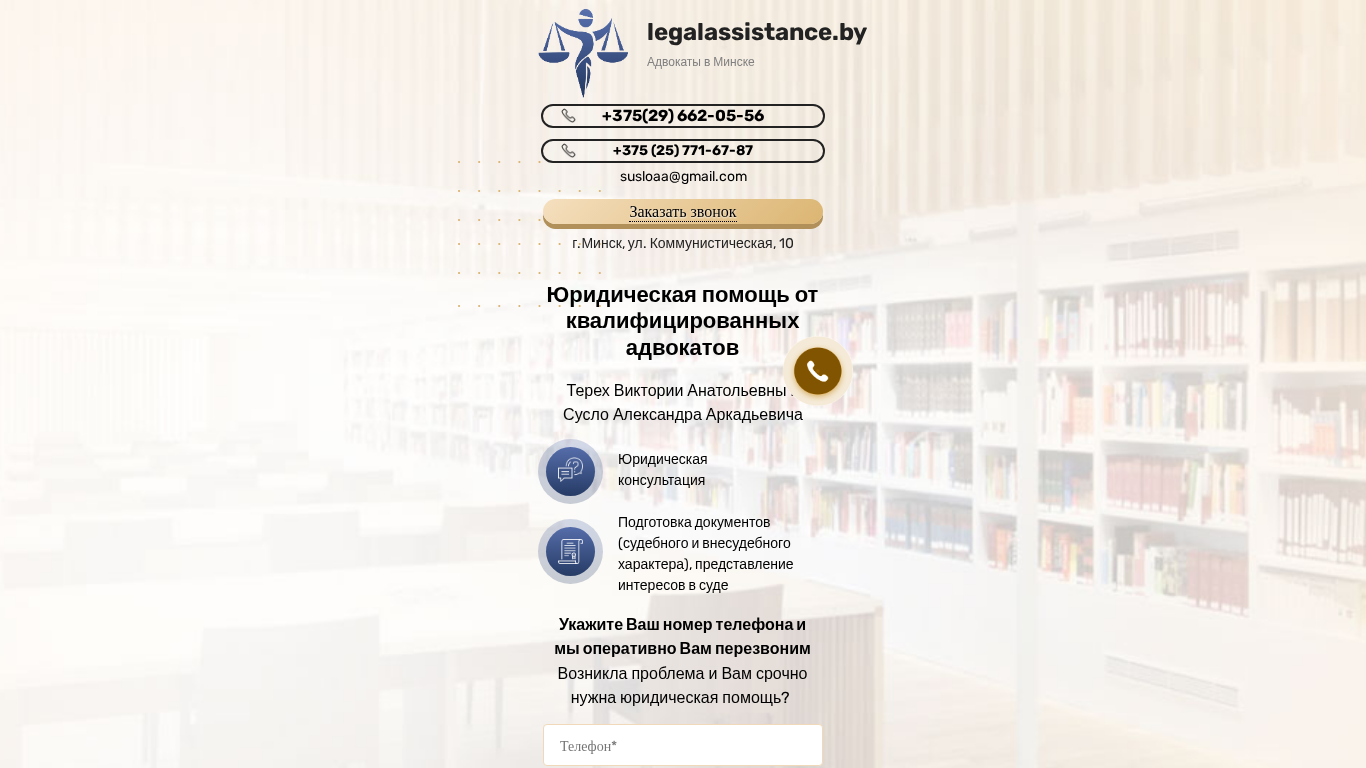 | AI-анализ | --- The website "Юридическая помощь" (Legal Assistance) offers legal consultation and representation services to clients in various areas of law. The top keywords include "помощь" (help), "споры" (disputes), "право" (law), "юридическая" (legal), and "звонок" (call). The website provides contact information for Susloaa@gmail.com and offers services such as corporate law, intellectual property, and execution proceedings. Clients can request a consultation by filling out a form on the website or by calling the provided phone numbers. The address of the office is given as Kommunisticheskaya ul., 10, in Minsk. The website also mentions services for arbitration, author's rights, business reputation protection, and land disputes. The office is open from 9:00 to 1 |
