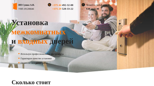 | AI-анализ | --- The web project "Установка межкомнатных и входных дверей" (Installation of Interior and Entrance Doors) offers professional door installation services with quality assurance. The team uses professional tools and has extensive experience. For pricing information, contact +375 29 528-33-22 or +375 44 492-32-88. Services include dismantling the old door, installing hinges and locks, assembling the door panel, and cutting door frames to size. Additional services, such as the installation of previously installed doors, are charged separately. The site provides pricing for various door types, including standard doors and entrance doors, and offers consultation services for an additional fee. The site was created using Tilda. |