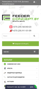 | AI-анализ | The web project FeederConcept.by is an official e-commerce store based in Minsk, Belarus, specializing in selling fishing feeders and related accessories. It is the authorized representative for a popular feeder brand in the country. The website provides a complete list of available products, current prices, and stock status. Discounts apply for self-pickup. Keywords associated with the site include 'fishing', 'feeder', 'shop', and 'Belarus'. Top words include 'feeder', 'concept', 'buy', 'rub', 'article', and 'distance'. The site offers a shopping cart, customer account registration and login, saved items for comparison, and contact information for phone orders. The product catalog includes various types of feeders, platforms, obveys, fishing reels, lines, hooks, and accessories. Customer reviews are also featured, praising the quality of the |