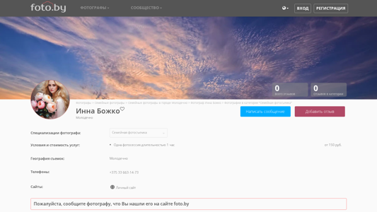| AI-анализ | --- This website belongs to family and personal photographer Inna Bozhko from Molodecnko. The main focus of the site is on family photography in the "Family Photo Shoot" category. The photographer offers her services as a family, personal, and content photographer in Molodecnko. Keywords related to the website include "photography," "family," "Molodecnko," "photographer," and "Inna Bozhko." The site includes a catalog of photographers, as well as a community for photographers. There are no reviews or ratings for the photographer on the site. |