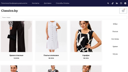 | AI-анализ | This online resource, titled "Classico," offers an e-commerce platform for purchasing various types of clothing such as trousers, skirts, dresses, and jackets. The website features a search function and multiple product listings, each with the option to select various parameters and make specific choices. The available items include denim and cotton trousers, dresses, and jackets, all with several variants to choose from. The website also includes sections for delivery information, payment methods, and contacts. The physical address for the business is provided, along with a legal registration number and copyright information. The website was registered in the Belarusian trade registry in March 2023. |
