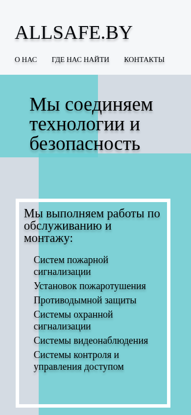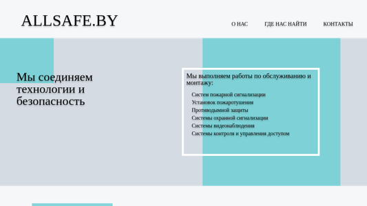 | AI-анализ | --- The portal allsafe.by provides services related to safety systems. The website offers solutions for fire alarm systems, fire extinguishing installations, antifreeze protection systems, and security alarm systems, as well as CCTV and access control systems. The site also offers servicing and installation of these safety systems, and sells systems tailored to specific requirements. The company is located in Minsk, Brestskaya Street 87, room 1N. For inquiries, contact +375 (29) 688 36 46 or email allsafe.minsk@gmail.com. |