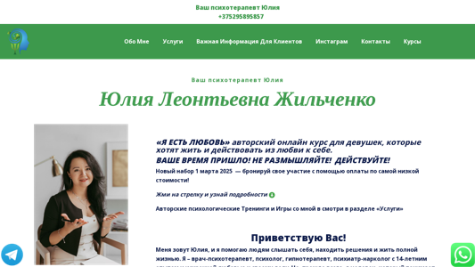 | AI-анализ | --- The web project "psychotherapist.by" is a website dedicated to the work of psychotherapist Julia Zhilchenko. The title of the website includes the description "ВРАЧ-ПСИХОТЕРАПЕВТ, ГИПНОТЕРАПЕВТ, ПСИХИАТР-НАРКОЛОГ" which translates to "Doctor-psychotherapist, hypnotherapist, psychiatrist-narcologist" in English. The keywords associated with the website include "курс" (course), "обучающий" (teaching), "мне" (me), "byn" (.by domain), "2019г" and "2018г" (years), "семинар" (se |