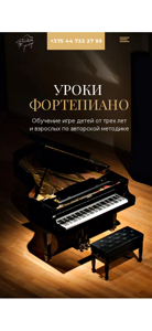 | AI-анализ | The portal "Уроки фортепиано" (PianoLessons.by) is a website offering piano lessons for children and adults using an author's method. The website primarily focuses on keywords related to piano lessons, such as "занятия" (lessons), "стоимость" (cost), and "уроки" (lessons). The site also includes terms like "программа" (program), "обучение" (education), and "дети" (children). The owner, Irina Ermalovich, is a piano teacher with a master's degree in pedagogy and over 20 years of experience. She emphasizes the importance of music in her life and offers lessons for children starting at the age of three and for adults. The site features various programs, including a developmental course for young children, a beginner's course |