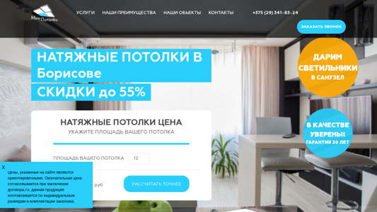 | SEO-описание | Натяжные потолки в Борисове. Двухуровневые, глянцевые, сатиновые, матовые, с фотопечатью фото. Акции! Гарантия 20 лет. Бесплатный замер! Доставка = 0 руб |