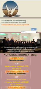 | AI-анализ | The website is for the Association of Choir Directors for Boys and Youths in Belarus. The homepage includes sections on the association, news, contacts, and a map displaying the locations of various children's choirs. Keywords associated with the site include 'association', 'chorus directors', 'boys', 'youths', 'Minsk', 'arts', and 'Shalyapin'. Top words include 'boys' (37 times), 'chorus' (31 times), 'youths' (21 times), and 'Minsk' (14 times). The site includes information about several children's choirs, such as the Republican Gimnazium-College choir at the Belarusian State Academy of Music, the Chorus of Boys and Youths 'Galasy Siabrou' at the Children's Music and Art |