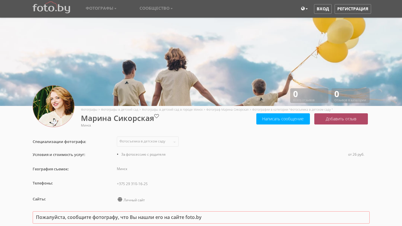 | AI-анализ | The web project "Фотограф Марина Сикорская, Минск. Фотографии в катеgorии "Фотосъемка в детском саду "" is a website for photographer Marina Sikorskaya, based in Minsk, Belarus. The site features photographs in the category "Фотосъемка в детском саду " (Photo shoots in a kindergarten). The photographer, Marina Sikorskaya, works as a photographer in a kindergarten in Minsk. The site includes a catalog of photographers, with this particular photographer's page showcasing her work in the given category. The site also includes a community for photographers and various categories for different types of photography. The site was visited on 21.11.2019 with no recorded reviews in the given category. The |