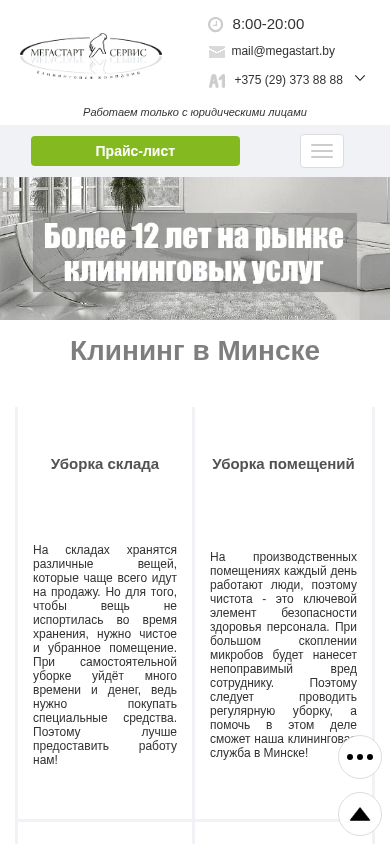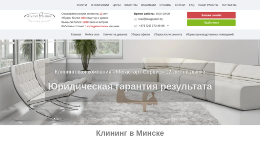 | AI-анализ | --- The portal megastart.by is a cleaning services company based in Minsk, Belarus. It offers professional cleaning services at affordable prices. The company, MegastartСервис, boasts being the number one cleaning service in Belarus. Services include cleaning of various spaces such as offices, homes, and production facilities. The company has been in business for 12 years and has cleaned over 400 apartments and houses, and washed over 1200 windows and vitrines. They only work with legal entities. Their operating hours are from 8:00 to 20:00. Contact information includes three phone numbers and an email address. They also provide an online price list and the option to order services via Viber. The company stresses the importance of keeping storage facilities clean to prevent damage to stored items and provides cleaning services for such spaces. They also offer cleaning |