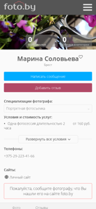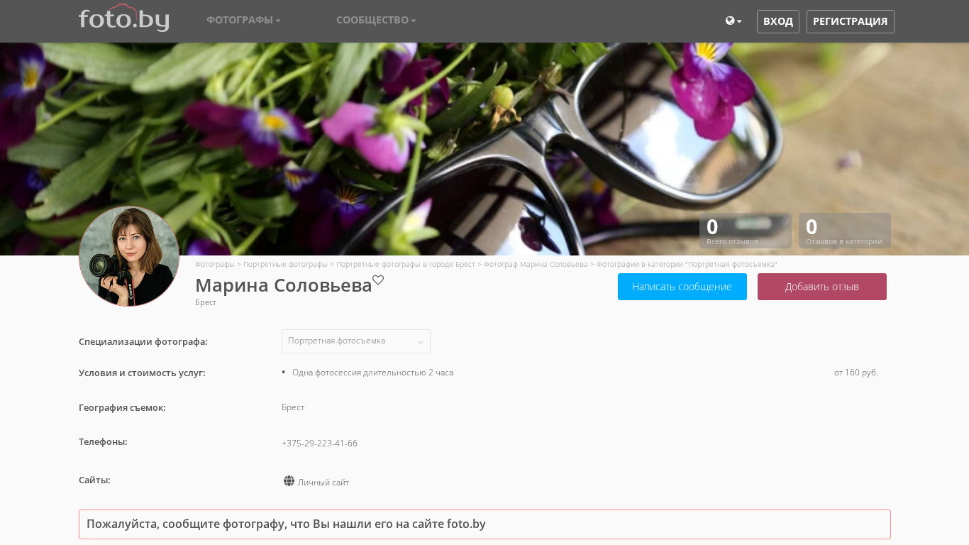 | AI-анализ | The website is of photographer Marina Solovyeva based in Brest, Belarus. The site focuses on portrait photography, with a category dedicated to this type of work. The photographer identifies herself as a Love Story, portrait, and wedding photographer in the cities of Brest. The site includes a catalog of photographers, with this photographer's page featuring her portfolio and contact information. The site also has a community section for photographers, but the homepage is set to display the catalog. The site was visited on October 16, 2023, and there are currently no reviews in the portrait category. The photographer's specializations include portrait, wedding, and family photography. Pricing and shooting locations are listed as being in Brest, with one photography session lasting 2 hours for a starting price of 160 rubles. The site also includes contact information, a personal website, and a |