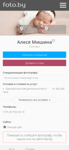 | AI-анализ | The web project "Фотограф Алеся Мишина, Солигорск" is a photography website specializing in newborn photo shoots. The photographer offers services in Soligorsk and has a large collection of props. The website includes a catalog of photographers, a community of photographers, and a blog. The main page displays the catalog of photographers by default. The photographer's services include family photography and newborn photography sessions, with prices starting at 360 rubles for a 4-hour session. The photographer's geographic coverage is limited to Soligorsk. The website includes contact information, a personal site, and a way to leave reviews for the photographer. The photographer's specialties are newborn photography, family photography, and photography at baptisms. |