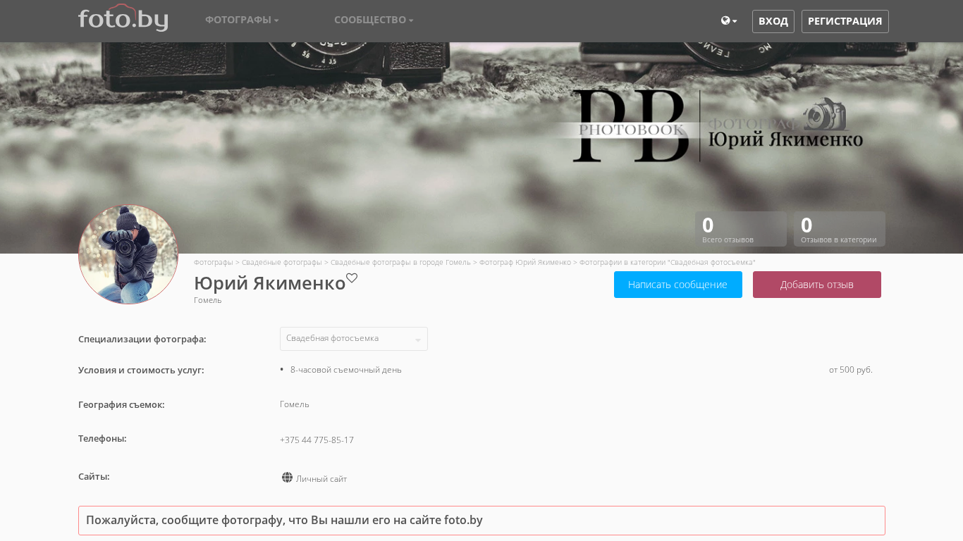 | SEO-описание | Фотографии в категории "Свадебная фотосъемка". Фотограф Юрий Якименко - выполняю следующие виды фотосъемок: свадебная фотосъемка, портретная фотосъемка, фотосъемка детей и выпускного. Работаю во всех городах Беларуси. |