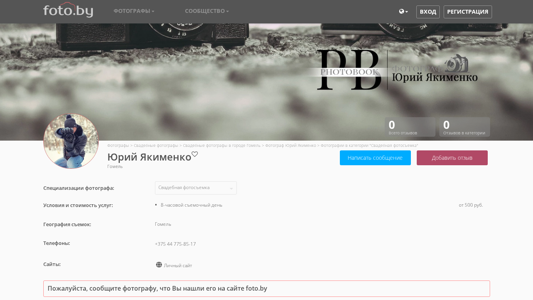 | AI-анализ | The website is a photography portfolio for Belarusian photographer Yuri Yakimenko based in Homel. The main focus of the site is on his work in the "Wedding Photography" category. Yuri offers various types of photography services, including wedding, portrait, child, and graduation photography. He is available to work in all cities in Belarus. Keywords associated with the site include "photography," "photographer," "Homel," "photographs," and "wedding." The site has a community section and allows users to leave reviews. The photographer's work can be found in various categories, such as "Swadebnye Fotografy" and "Portrety," and he has a personal website at yakimenko.foto.by. |