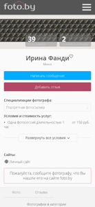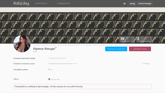 | AI-анализ | --- This online resource is a personal photography website belonging to Irina Fandi, a photographer based in Minsk, Belarus. The website focuses on portrait photography as evidenced by the title and keywords. The description section indicates that Irina aims to create a relaxed atmosphere during photo sessions to make clients feel comfortable and natural. She offers guidance on posing and appearance, and provides services on-site. The website also features a community section where users can view other photographers' work, write reviews, and connect with each other. The website's main page showcases a catalog of photographers, with Irina Fandi's portfolio in the 'Portrait Photographers in Minsk' category. The website includes sections for various types of photography such as architectural, industrial, and food photography, among others. Users can also find information on pricing, locations, and contact details for Irina's services |