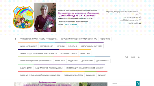 | AI-анализ | The web project "Детский сад 19 г.Кричева" is an educational institution website managed by the Education Department of Krichev District Executive Committee. The website provides information about the State Educational Establishment "Children's Garden No. 19 in Krichev," including its working hours (Monday-Friday, 7.30-16.00), contact information (phone numbers: +375 2241 64-303 and sad19@krichev.edu.by), and a map of the location in Krichev, Microdistrict Komsoomolsky, 14A. The site includes sections for the management team, public inquiries, legal documents, and a calendar for citizen visits. Electronic inquiries are also accepted. Popular inquiries are listed |