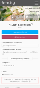 | AI-анализ | The web project "Фотограф Лидия Баженова, Витеbsk" is a photography website dedicated to the work of Lidia Baженова, a photographer based in Витеbsk, Belarus. The website primarily features photographs in the "Детская фотосъемка" (Child Photography) category. Lidia identifies herself as a children's photographer on the site. The website is part of the larger "фотографы" (photographers) section on Foto.by, a photography community and catalog. Other categories on the site include architectural, portrait, and event photography, among others. The website includes a contact telephone number and a personal site link. |