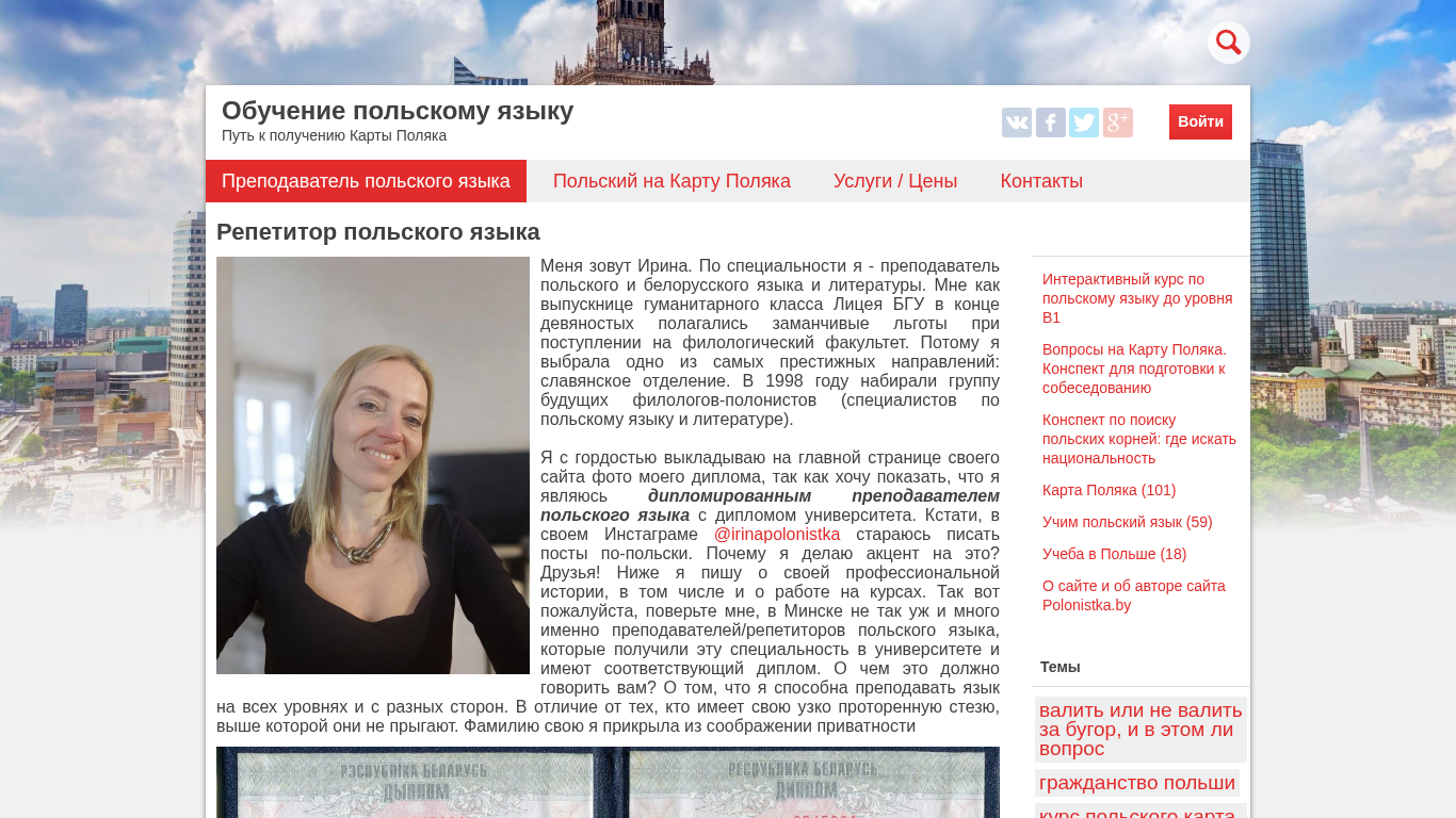 | Ключевые слова | репетитор польского языка минск репетитор польского языка карта поляка с нуля курсы польского учеба в Польше польский язык обучение польскому языку |