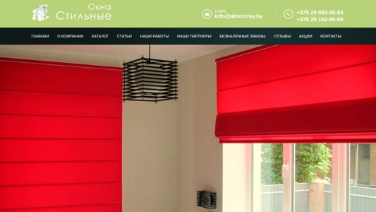 | AI-анализ | The portal "Abmstroy.by" is a window covering store in Minsk, Belarus. It offers a wide range of roll-down blinds and shades for purchase, including classic, plastic, tinted, wooden, and aluminum options, as well as vertical and horizontal designs. The website provides detailed information on various products and their features, such as roll-down blinds in a box and day-night combos. The company also offers bespoke solutions, and customers can contact them via phone or email for inquiries or consultations. Keywords for the website include "buying blinds and roller shades in Minske" and top words are "blinds," "shades," "windows," and "Minsk." |