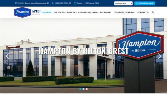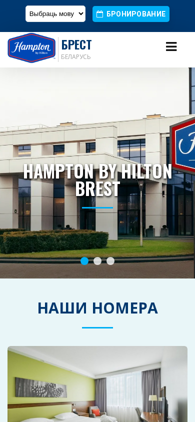| SEO-описание | Официальный сайт гостиницы Хэмптон Хилтон, Брест - новый отель с удобным расположением в центре Бреста для деловых и туристических поездок. 120 комфортабельных номеров, Лобби-бар и Фитнес-зал 24/7, бесплатные горячие завтраки и Wi-Fi на всей территории. |