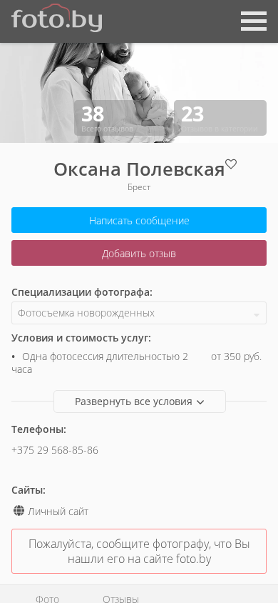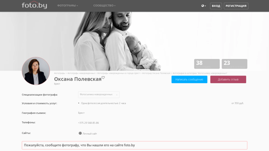 | AI-анализ | --- The portal polevskaya.foto.by specializes in photography services for newborns. Photographer Oxana Polevskaya offers various photo shoots including family, maternity, and newborn photography. She covers the city of Minsk for her shoots. The website includes a community of photographers and a catalog featuring reviews and portfolios. Visitors can also find information on pricing and contact details. The site had 23 user visits and 38 reviews in the newborn photography category. The photographer's specialties include newborn, child, and family photography, and the cost for a 2-hour session starts from 350 rubles. |