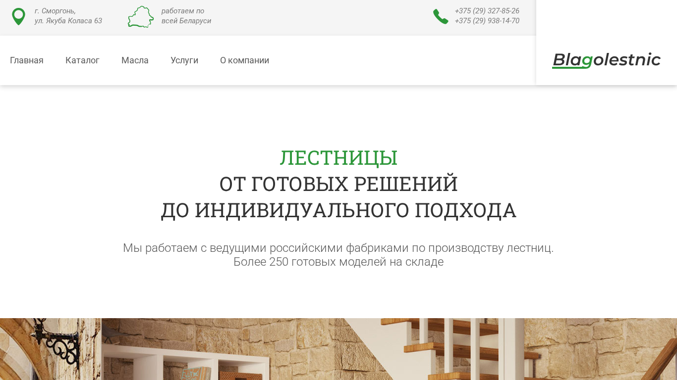 | AI-анализ | The portal Blagolestnic is a Belarusian company selling and installing wooden and metal stairs in Smorgoni and throughout Belarus. With over 250 ready-made models in stock, they offer a wide range of stair options to fit various spaces. They also provide custom stair solutions according to individual client preferences. The company works with leading Russian stair manufacturers and uses high-quality European machinery for production. They offer professional installation services and a two-year warranty on correctly installed stairs. The website features a catalog section where users can browse and select ready-made stair options, as well as request custom solutions. The site also includes information about the company's oil for stair maintenance and decorative coatings. |