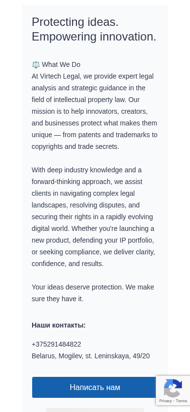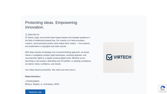 | AI-анализ | language: ru region: BY content_length: 515 This website, titled "Protecting ideas. Empowering innovation.", is operated by Virtech Legal, a Belarusian company based in Mogilev. The primary focus of the site is to provide expert legal analysis and strategic guidance in the field of intellectual property law. Virtech Legal aims to help innovators, creators, and businesses protect their unique assets, including patents, trademarks, copyrights, and trade secrets. The company boasts deep industry knowledge and a forward-thinking approach, enabling them to assist clients in navigating complex legal landscapes, resolving disputes, and securing their rights in the rapidly evolving digital world. Their services cater to various needs, such as launching new products, defending IP portfolios, and ensuring compliance. The site offers a contact form for inquiries, but |
