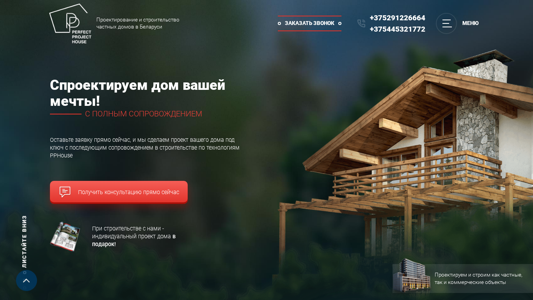 | AI-анализ | The web project "PPHouse.by" is a home design and construction service based in Minsk, Belarus. It offers individual solutions for residential building projects with pricing and blueprints included. The website features a call-to-action menu to request a call back at +375291226664 or +375445321772, and an option to request a consultation directly. The company specializes in creating custom architectural projects and comprehensive construction of private and commercial properties, with a team of 18 highly qualified specialists, and over 1500 completed projects and 136 built objects in 6 years. In addition to project design and construction, the company also provides land surveying, engineering network design for water supply, sewage, ventilation, electricity, and gas systems, interior design, and individual cost estimates. |