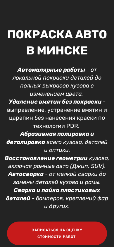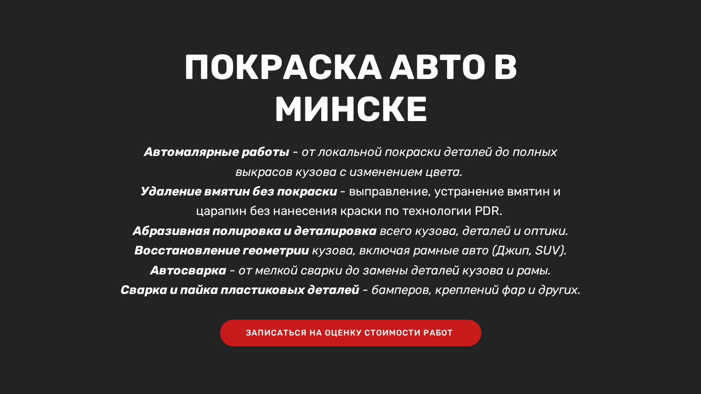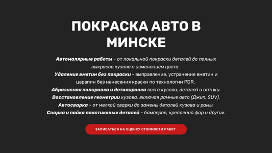 | Название / Заголовок | Покраска авто в Минске, полировка, удаление вмятин, кузовной ремонт, цены и отзывы |