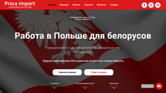 | AI-анализ | language: ru This online resource is the official website of Praca Import, a recruitment agency that facilitates employment opportunities in Poland for Belarusian citizens. The site offers formal employment with high wages, providing over 500 clients with jobs in European countries. Visitors can make inquiries, submit applications, and find various guarantees, contacts, and assistance. The agency specializes in recruiting for various industries, including trucking, manufacturing, and construction, with vacancies available in the European Union. The site includes sections for vacancies, news, contracts, contacts, and help. Some of the offered jobs include international truck drivers, production workers, and factory workers, with wages ranging from 25 zl/hour to 3000 EUR/month netto. The agency assists in obtaining work visas and signing employment contracts within Belarus. |