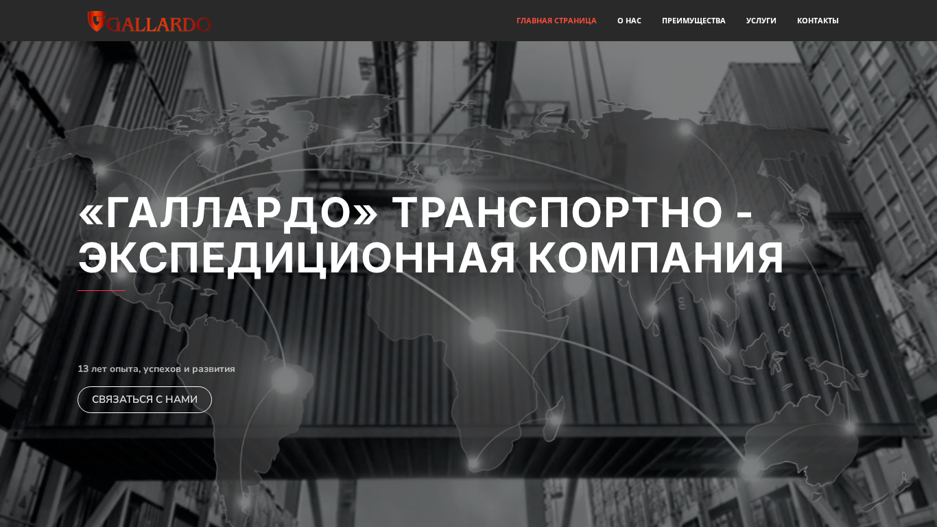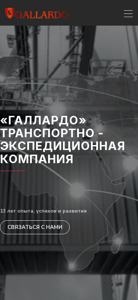 | AI-анализ | The web project "Gallardo" is a transportation-expedition company with a title "Галлардо" and a description in Russian stating "Transport and Expedition Company". The website offers services for transporting various goods, with keywords related to contact, transportation, and services. The company has been in operation for 13 years and provides logistics services, transporting goods both domestically and internationally, including to countries in the CIS and Europe. They offer a range of services, including the transport of individual and consolidated goods, and provide tented and refrigerated trucks with a capacity of 22 tons. The company boasts a modern and professional approach, with a fleet of over 70 trucks and over 5,000 completed transports per year. Their advantages include a private fleet, qualified specialists, individual client approach, a comprehensive solution, insurance coverage of up to €5 |