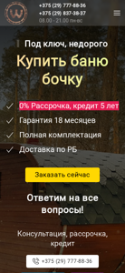 | AI-анализ | --- The website is for a company named Woodland, selling and producing barrel-shaped saunas, or "banias bochkas," in Minsk, Belarus. The company offers various sizes of these barrel saunas, ranging from 2 to 6 meters, with prices starting at 4860 Br for a 2-meter unit. Customers can purchase these saunas under a 0% financing plan and receive them within a week. The website provides a catalog of the various sizes and prices, as well as contacts for inquiries and orders. The company also offers a 18-month warranty on their products. |