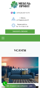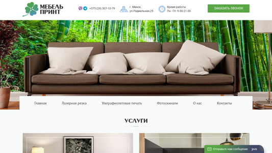 | AI-анализ | The portal Mebelprint.by offers photo printing services in Minsk, Belarus. The offered products include printing on glass, film, and fabric on a custom basis. The website provides information on laser cutting, ultraviolet printing, photo panels, and photo screens. The company's production is eco-friendly with quick turnaround times from 2 to 10 days and a 10-year guarantee. Contact information is available, including a phone number and business messenger. The main categories are laser cutting, ultraviolet printing, photo panels, and contacts. The website features a call-to-action button and an option to calculate the cost. The design includes two sliders showcasing various photo products and a footer with links to the main categories and contact information. The website is copyrighted © 2021 Mebelprint.by, with all rights reserved. |